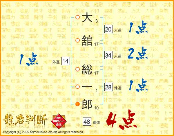 大(3画)舘(17画) 総(17画)一(1画)郎(10画)