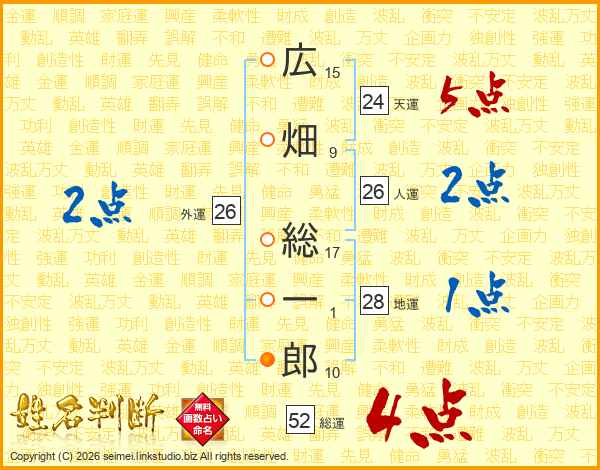 広(15画)畑(9画) 総(17画)一(1画)郎(10画)