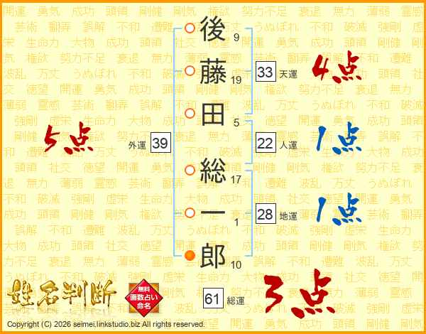 後(9画)藤(19画)田(5画) 総(17画)一(1画)郎(10画)