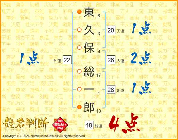 東(8画)久(3画)保(9画) 総(17画)一(1画)郎(10画)