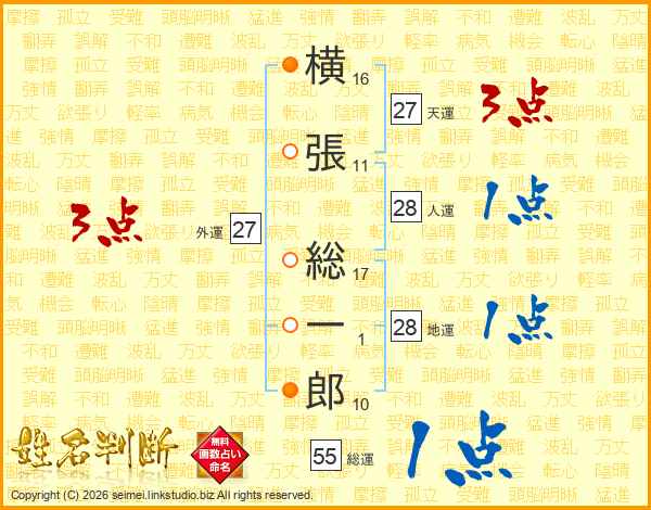 横(16画)張(11画) 総(17画)一(1画)郎(10画)