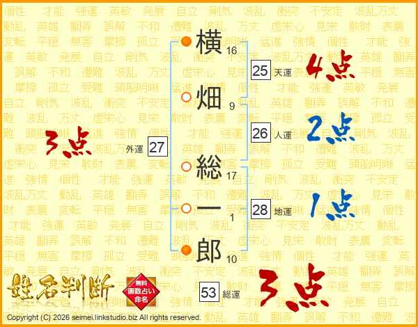 横(16画)畑(9画) 総(17画)一(1画)郎(10画)