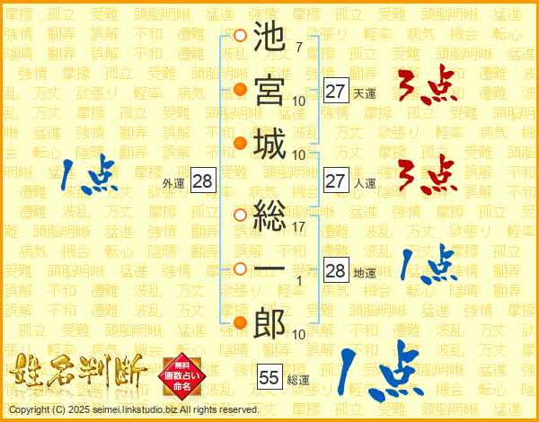 池(7画)宮(10画)城(10画) 総(17画)一(1画)郎(10画)