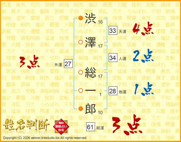 渋(16画)澤(17画) 総(17画)一(1画)郎(10画)