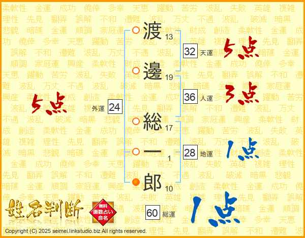 渡(13画)邊(19画) 総(17画)一(1画)郎(10画)