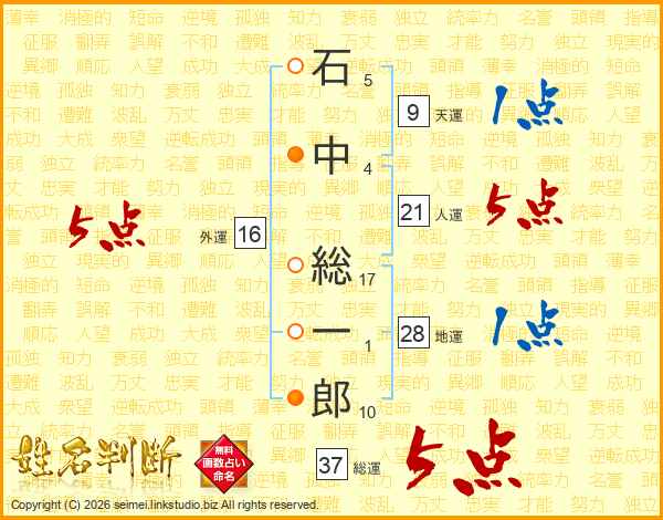 石(5画)中(4画) 総(17画)一(1画)郎(10画)