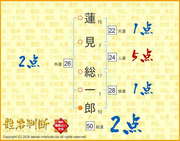 蓮(15画)見(7画) 総(17画)一(1画)郎(10画)