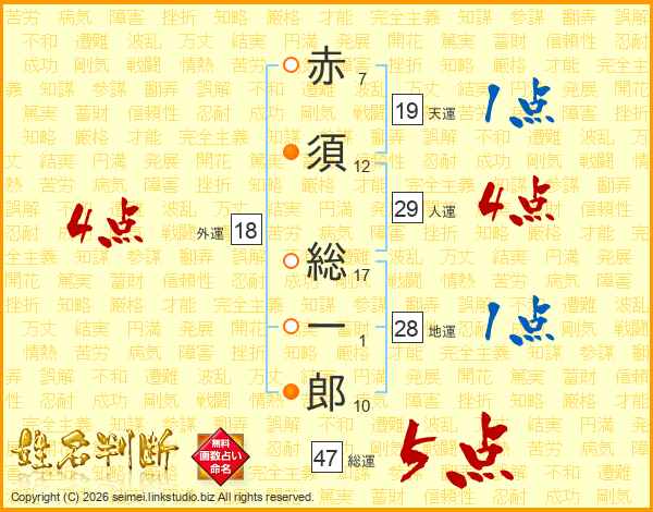 赤(7画)須(12画) 総(17画)一(1画)郎(10画)