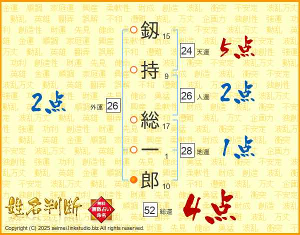 釼(15画)持(9画) 総(17画)一(1画)郎(10画)