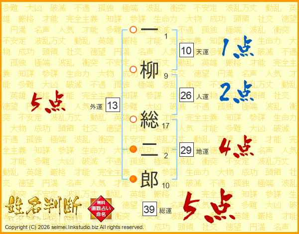 一(1画)柳(9画) 総(17画)二(2画)郎(10画)