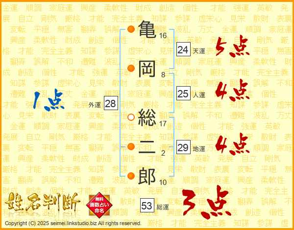 亀(16画)岡(8画) 総(17画)二(2画)郎(10画)