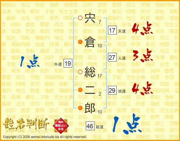 宍(7画)倉(10画) 総(17画)二(2画)郎(10画)