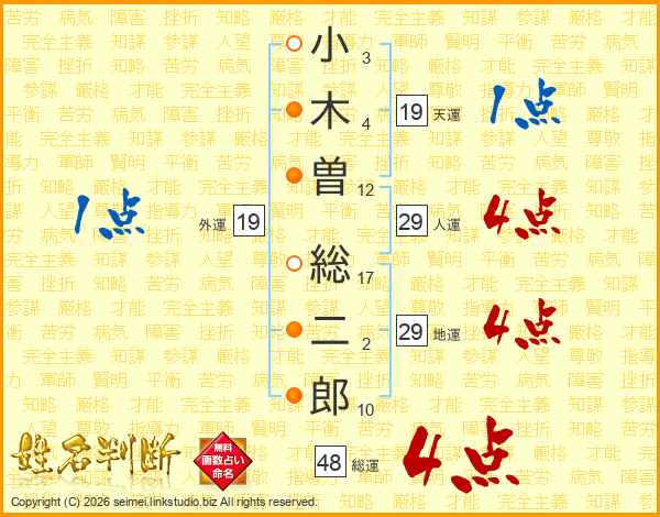 小(3画)木(4画)曽(12画) 総(17画)二(2画)郎(10画)