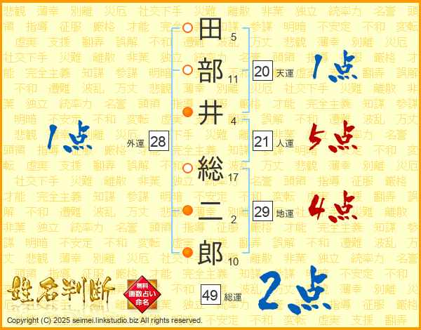 田(5画)部(11画)井(4画) 総(17画)二(2画)郎(10画)