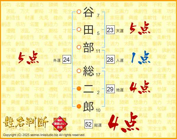 谷(7画)田(5画)部(11画) 総(17画)二(2画)郎(10画)
