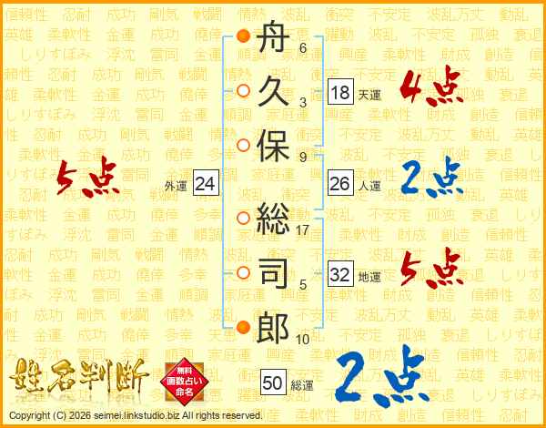 舟(6画)久(3画)保(9画) 総(17画)司(5画)郎(10画)