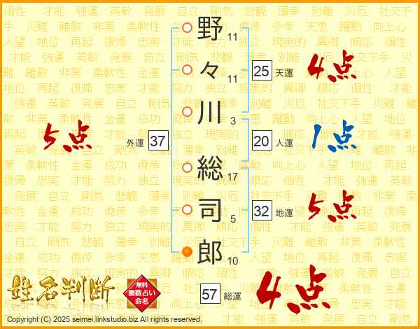 生活面を象徴する運勢です。外部から受ける影響力を表し、結婚運、家庭運や職場、環境への順応性を表します。総運から人運を引いた画数。姓や名が1文字の場合を除く。