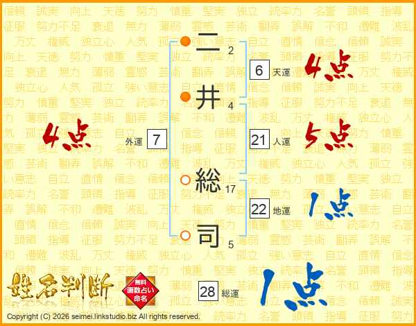 家系が持つ宿命的な運勢を表します。祖先から受け継いだ苗字ですので自分の力が及びません。家柄を象徴します。苗字の合計画数。