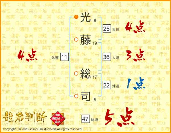 あなたの人生を表す1番重要な運勢です。生涯を通じて影響する総合運となり、主に50歳以降の晩年期に影響を及ぼします。苗字と名前の合計画数。