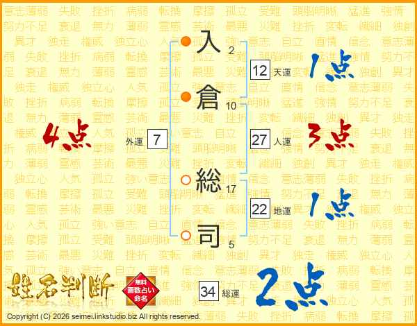 入(2画)倉(10画) 総(17画)司(5画)