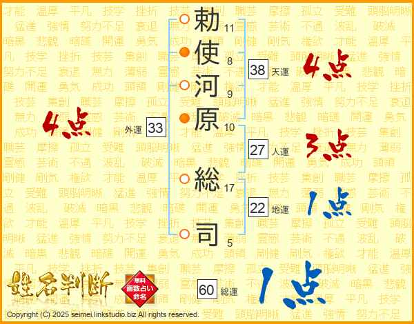 勅(11画)使(8画)河(9画)原(10画) 総(17画)司(5画)