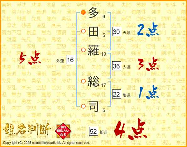 多(6画)田(5画)羅(19画) 総(17画)司(5画)