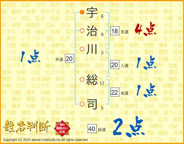 宇(6画)治(9画)川(3画) 総(17画)司(5画)