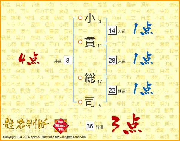 生活面を象徴する運勢です。外部から受ける影響力を表し、結婚運、家庭運や職場、環境への順応性を表します。総運から人運を引いた画数。姓や名が1文字の場合を除く。