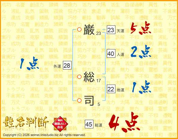 生活面を象徴する運勢です。外部から受ける影響力を表し、結婚運、家庭運や職場、環境への順応性を表します。総運から人運を引いた画数。姓や名が1文字の場合を除く。