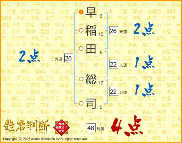 早(6画)稲(15画)田(5画) 総(17画)司(5画)