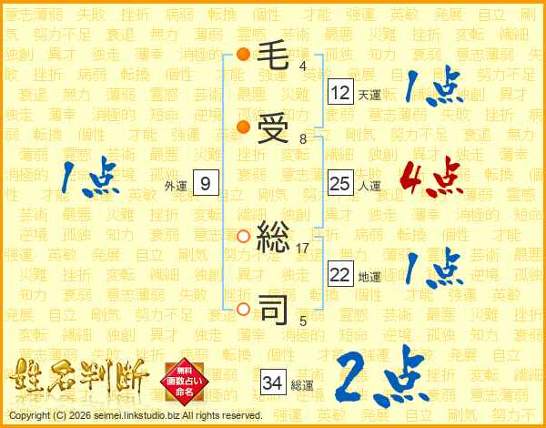 あなたの人生を表す1番重要な運勢です。生涯を通じて影響する総合運となり、主に50歳以降の晩年期に影響を及ぼします。苗字と名前の合計画数。