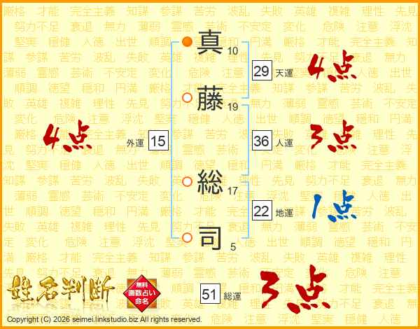 あなたの人生を表す1番重要な運勢です。生涯を通じて影響する総合運となり、主に50歳以降の晩年期に影響を及ぼします。苗字と名前の合計画数。
