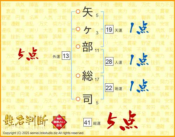 矢(5画)ヶ(3画)部(11画) 総(17画)司(5画)