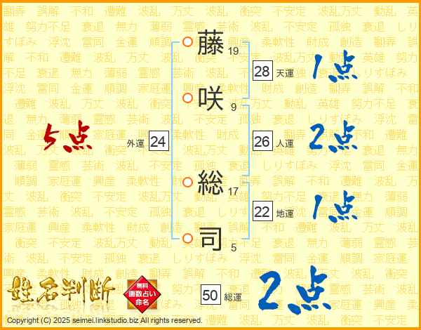 生活面を象徴する運勢です。外部から受ける影響力を表し、結婚運、家庭運や職場、環境への順応性を表します。総運から人運を引いた画数。姓や名が1文字の場合を除く。