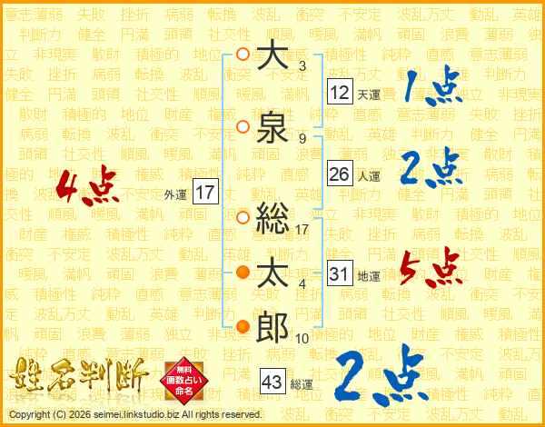 大(3画)泉(9画) 総(17画)太(4画)郎(10画)