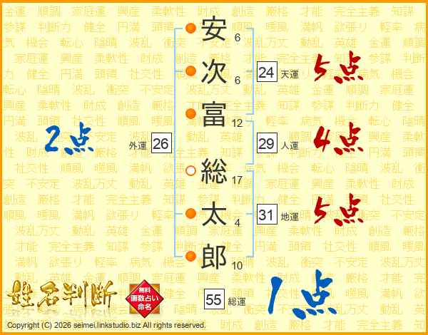 安(6画)次(6画)富(12画) 総(17画)太(4画)郎(10画)