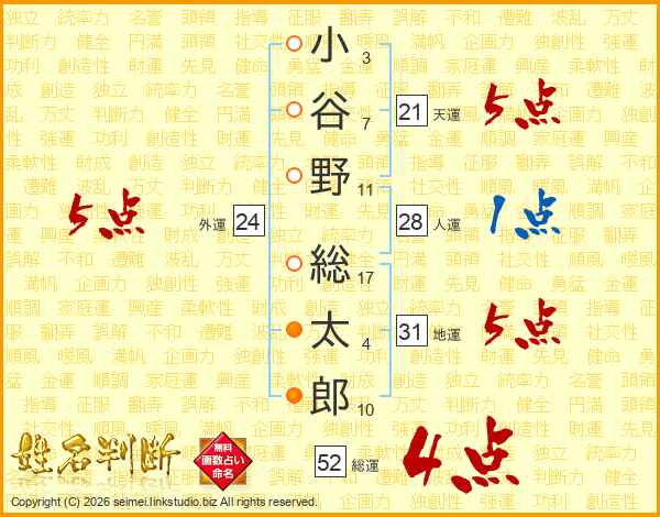 小(3画)谷(7画)野(11画) 総(17画)太(4画)郎(10画)