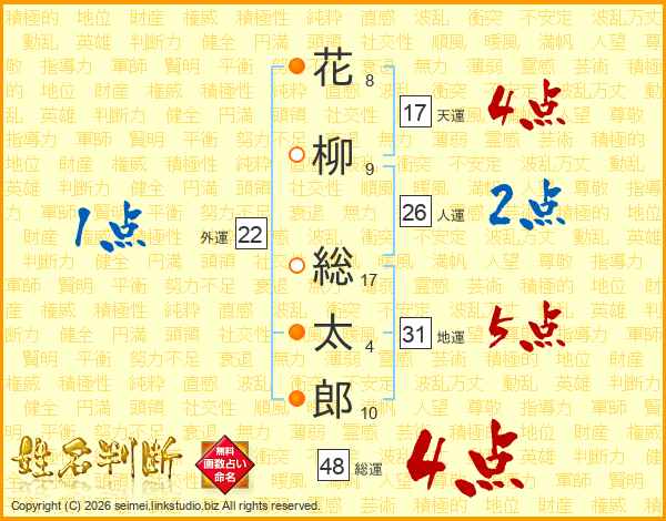 花(8画)柳(9画) 総(17画)太(4画)郎(10画)