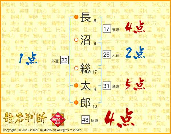長(8画)沼(9画) 総(17画)太(4画)郎(10画)