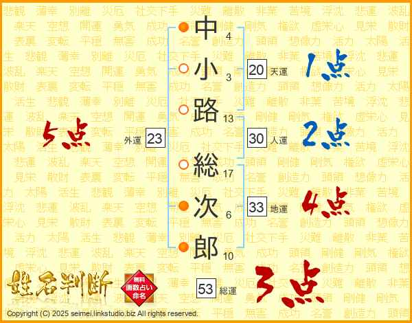 中(4画)小(3画)路(13画) 総(17画)次(6画)郎(10画)