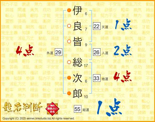 伊(6画)良(7画)皆(9画) 総(17画)次(6画)郎(10画)