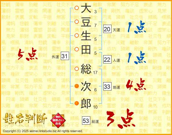 大(3画)豆(7画)生(5画)田(5画) 総(17画)次(6画)郎(10画)