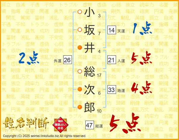 小(3画)坂(7画)井(4画) 総(17画)次(6画)郎(10画)
