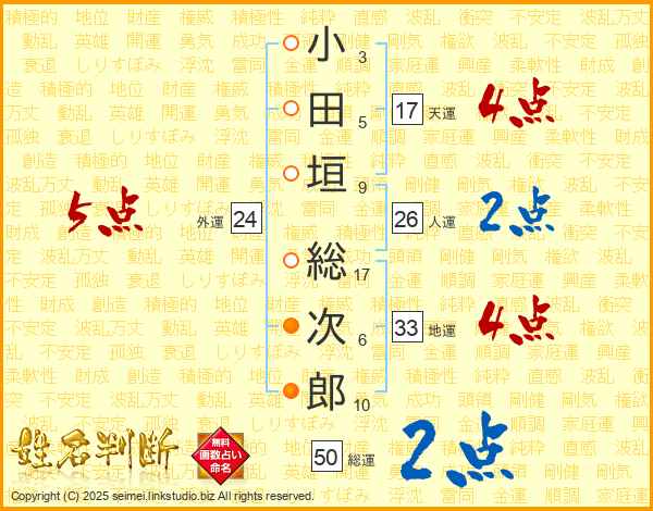 小(3画)田(5画)垣(9画) 総(17画)次(6画)郎(10画)