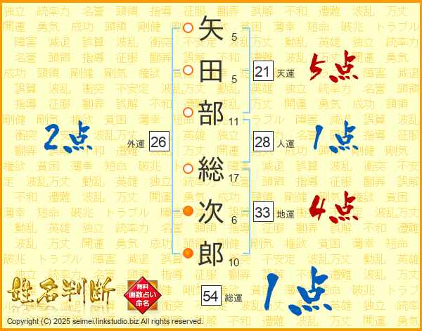 矢(5画)田(5画)部(11画) 総(17画)次(6画)郎(10画)