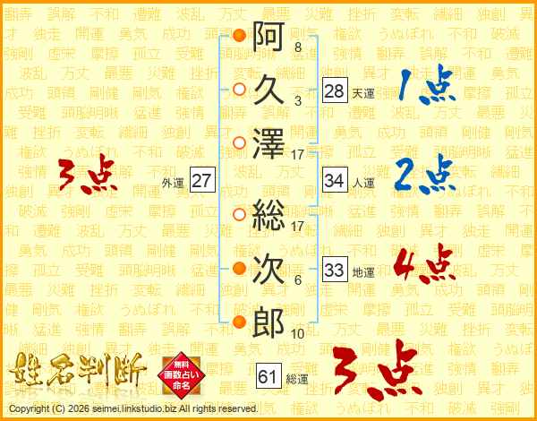 阿(8画)久(3画)澤(17画) 総(17画)次(6画)郎(10画)
