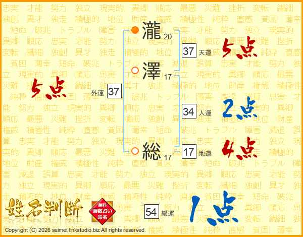 家系が持つ宿命的な運勢を表します。祖先から受け継いだ苗字ですので自分の力が及びません。家柄を象徴します。苗字の合計画数。