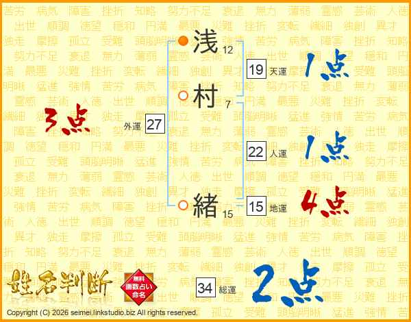 浅(12画)村(7画) 緒(15画)