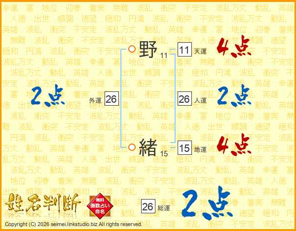 生活面を象徴する運勢です。外部から受ける影響力を表し、結婚運、家庭運や職場、環境への順応性を表します。総運から人運を引いた画数。姓や名が1文字の場合を除く。