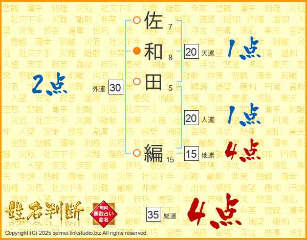 生活面を象徴する運勢です。外部から受ける影響力を表し、結婚運、家庭運や職場、環境への順応性を表します。総運から人運を引いた画数。姓や名が1文字の場合を除く。